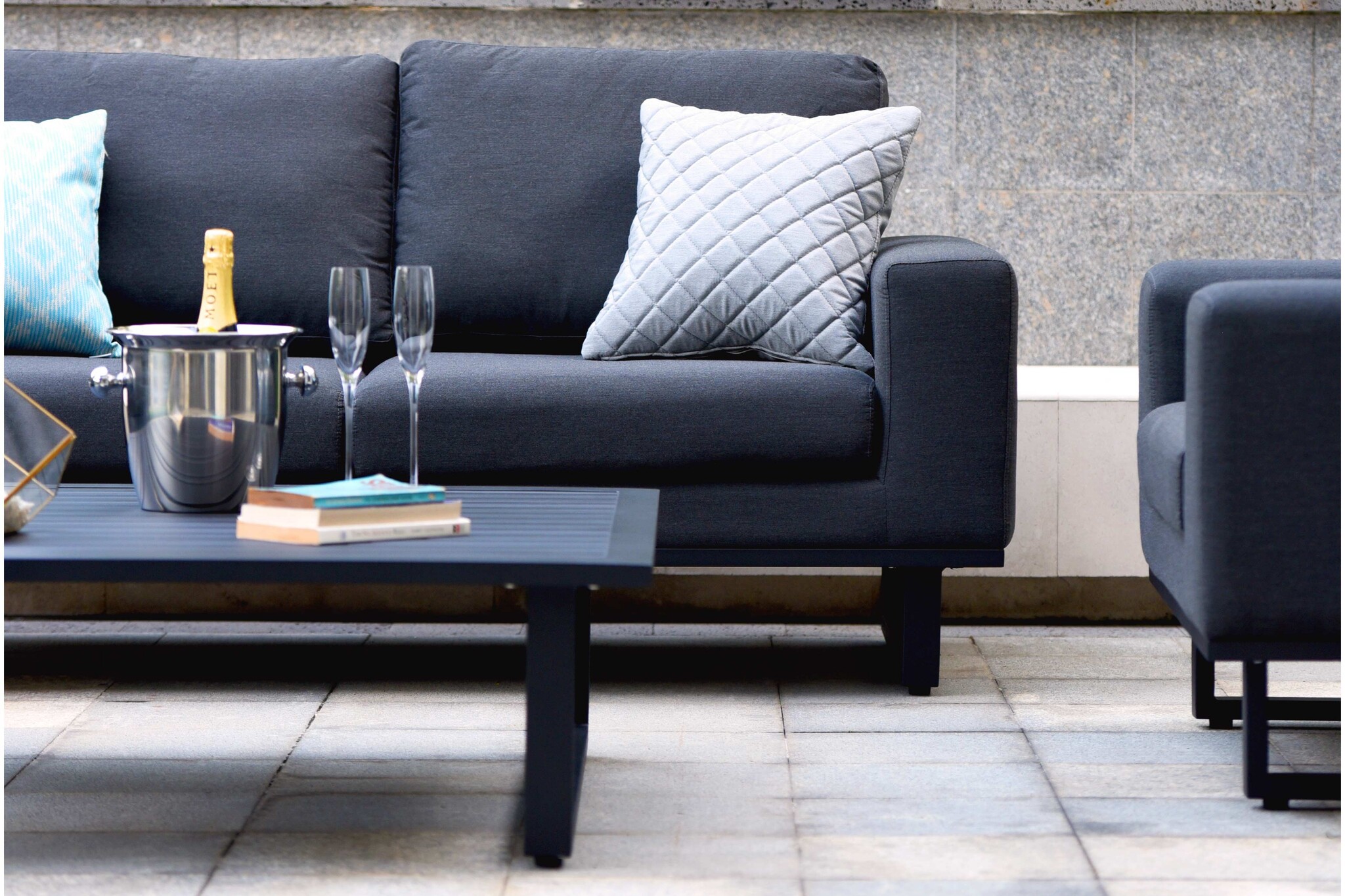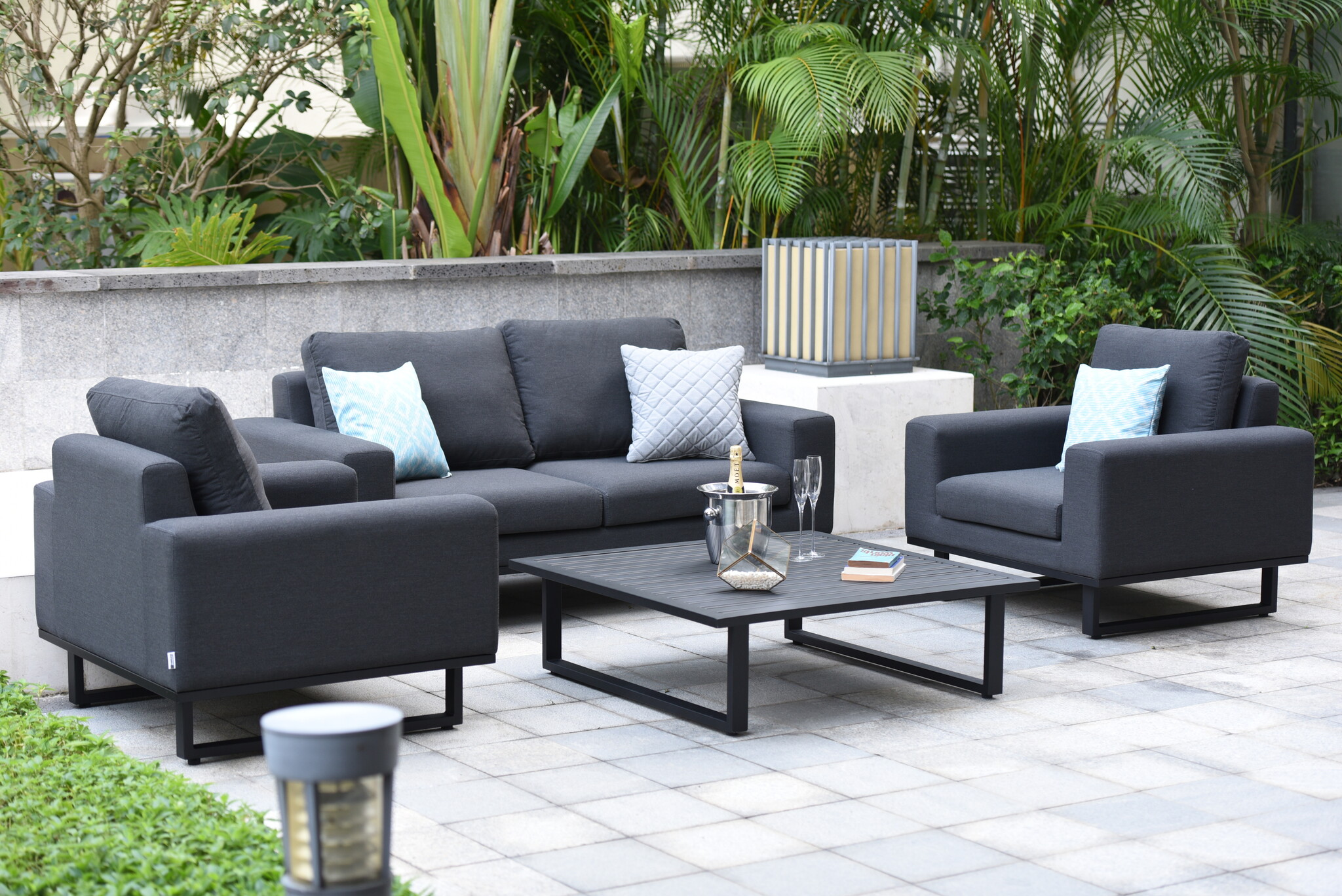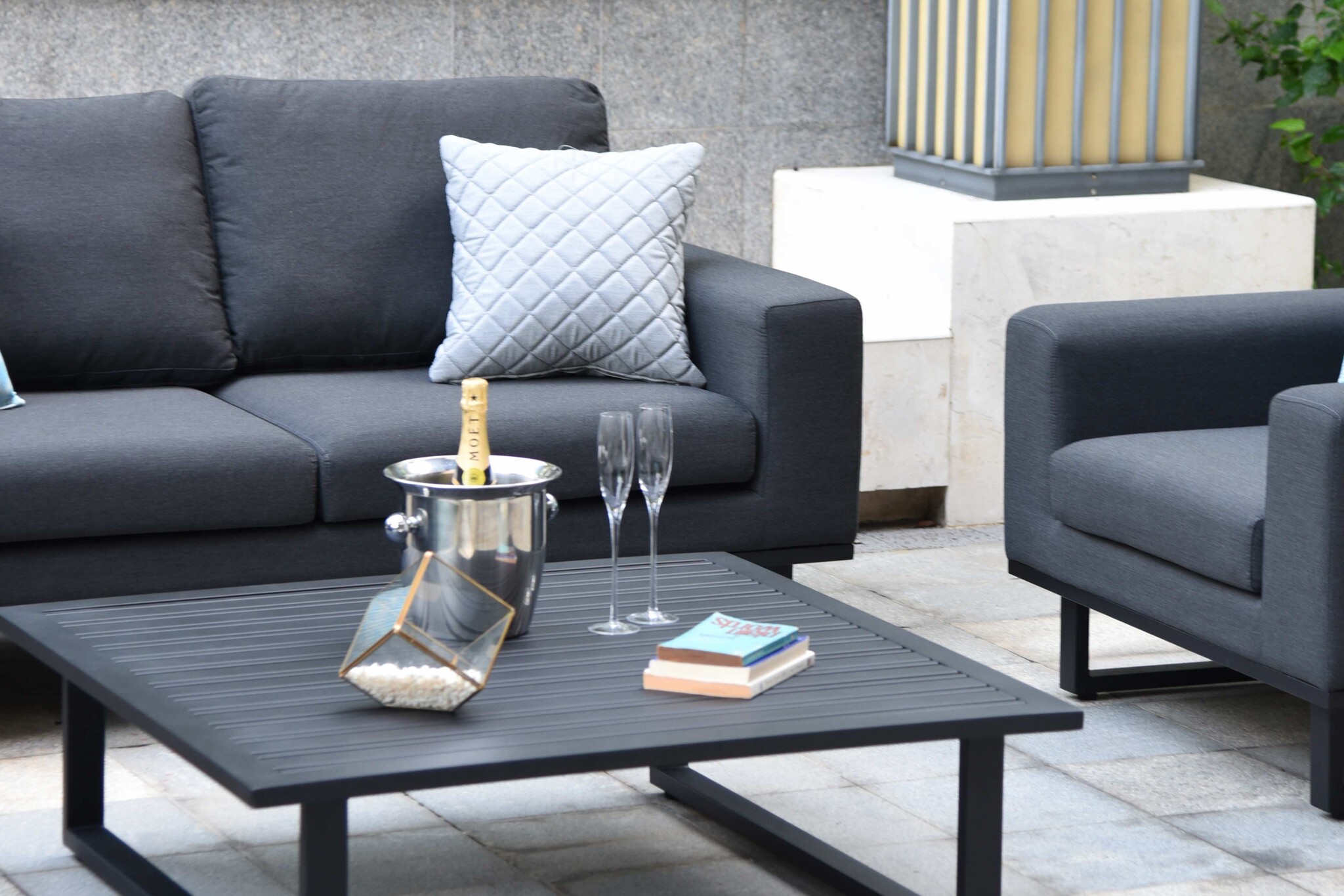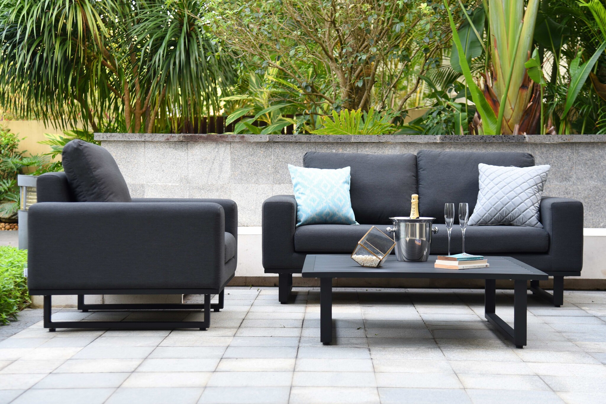 De All weather loungeset Ethos biedt een uniek gevormd ontwerp, met gedurfde lijnen en dikke armleuningen voor ultiem comfort. De bank / stoel combinatie voor buiten verenigt uw binnen- en buitenruimte echt door de grenzen tussen uw huis en tuin te vervagen, terwijl u toch het uiterlijk behoudt van binnenmeubilair, die buiten hoort. In combinatie met een aluminium salontafel met lamellen en bijpassende poten complimenteren de frames de hoogwaardige kleur van de buitenstof.