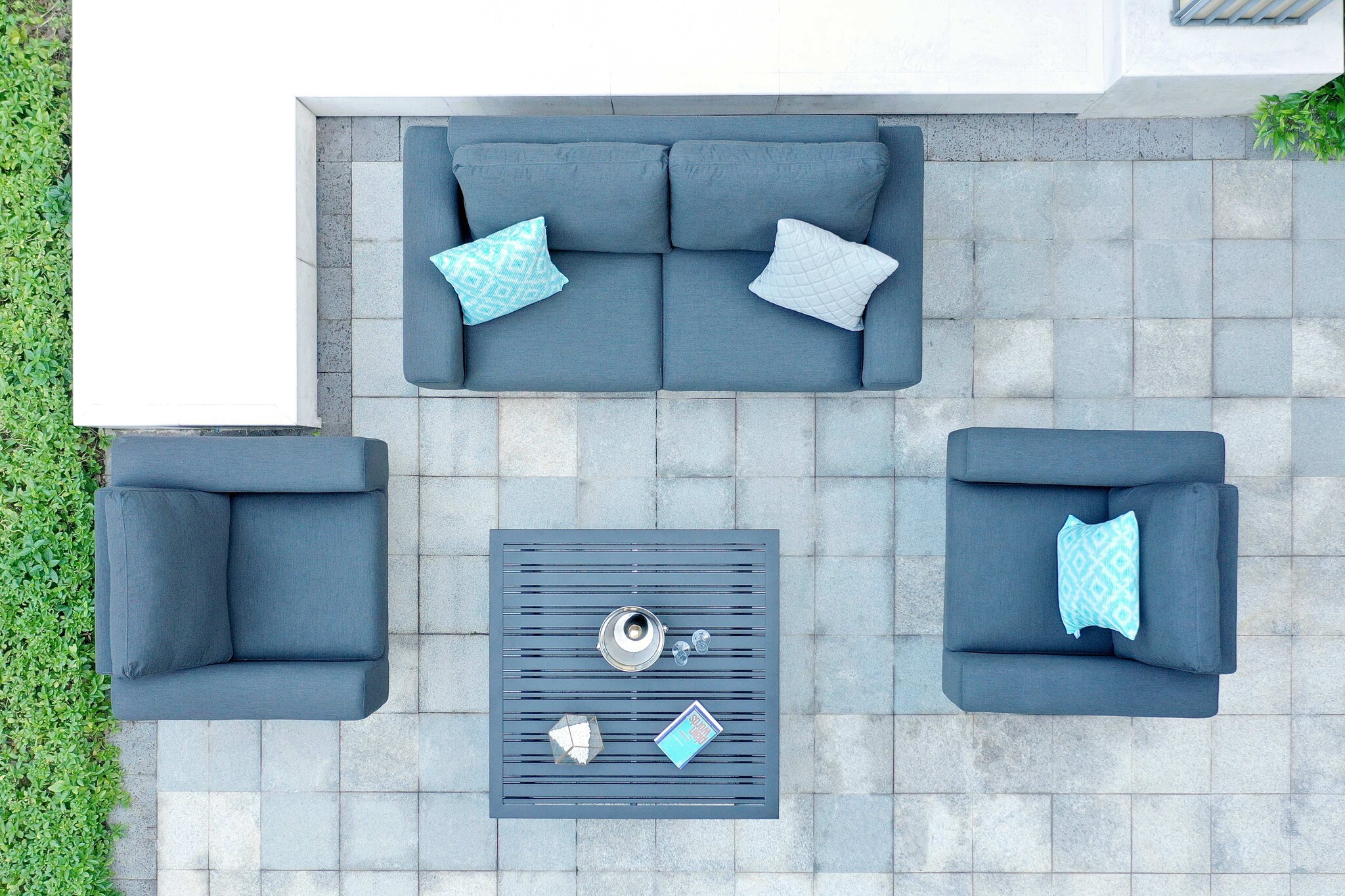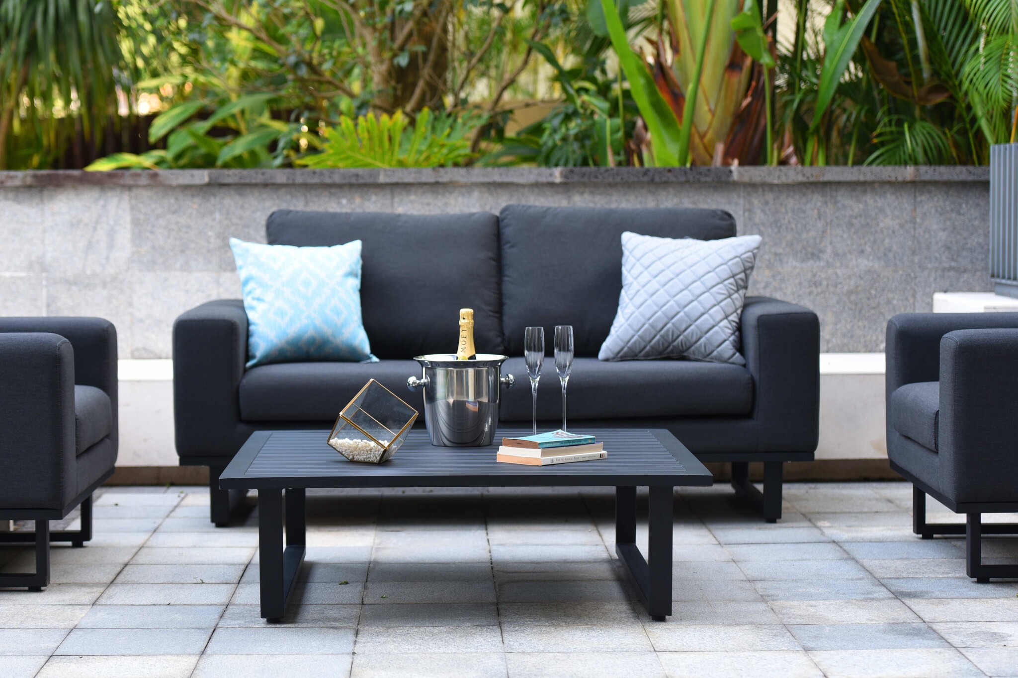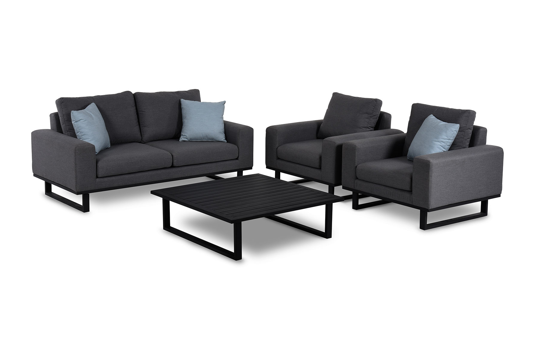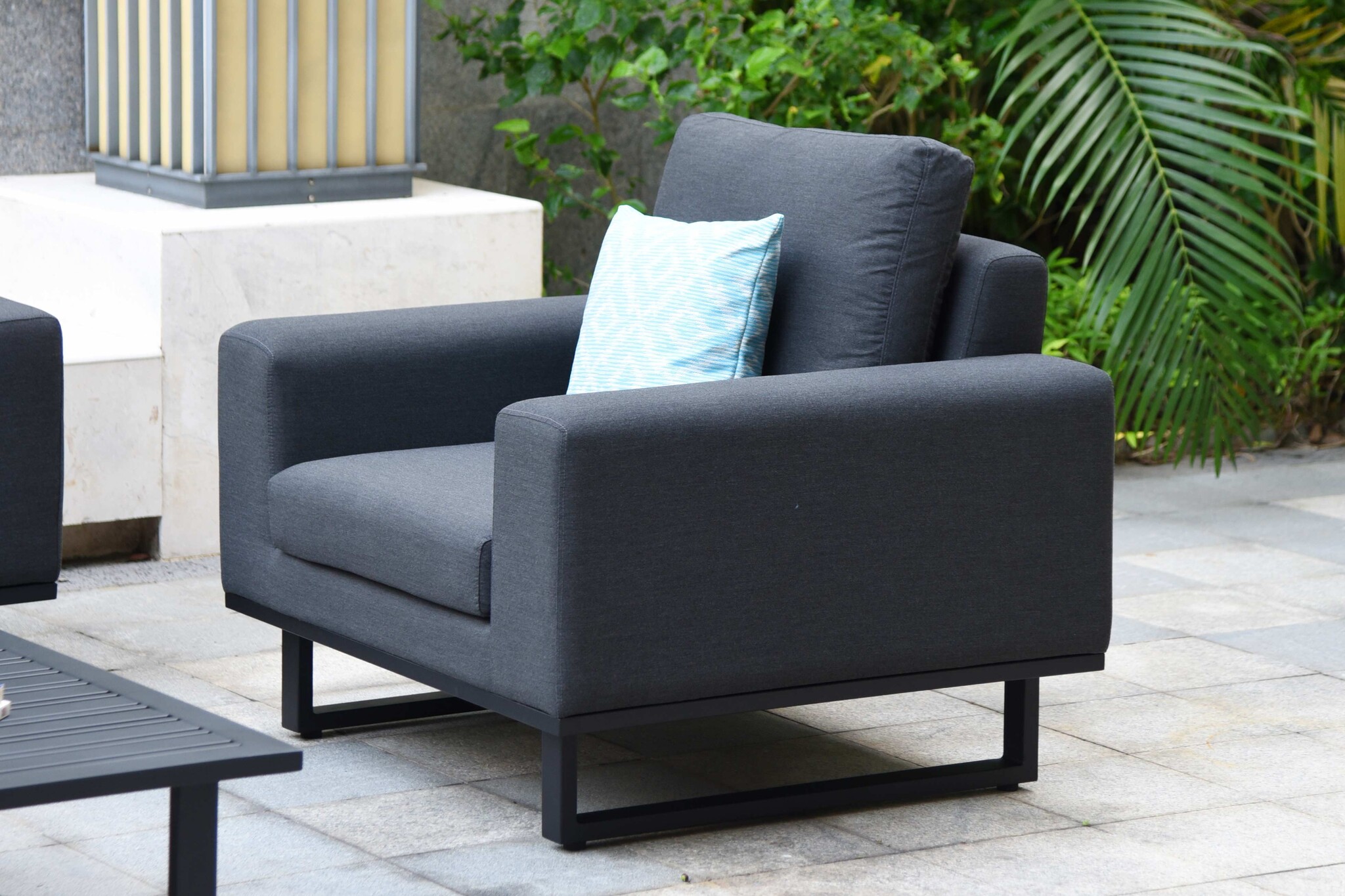 De All weather loungeset Ethos biedt een uniek gevormd ontwerp, met gedurfde lijnen en dikke armleuningen voor ultiem comfort. De bank / stoel combinatie voor buiten verenigt uw binnen- en buitenruimte echt door de grenzen tussen uw huis en tuin te vervagen, terwijl u toch het uiterlijk behoudt van binnenmeubilair, die buiten hoort. In combinatie met een aluminium salontafel met lamellen en bijpassende poten complimenteren de frames de hoogwaardige kleur van de buitenstof.