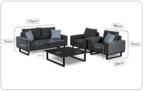 Afmetingen: | Loungeset (l x b x h): 2x stoel (l*b*h): 96*89*74 cm| Gewicht: 15.2 kg 1x tweezitter bank (l*b*h): 175*89*74 cm | Gewicht: 24,4 kg 1x tafel (l*b*h): 104*104*32 cm | Gewicht: 14.2 kg |