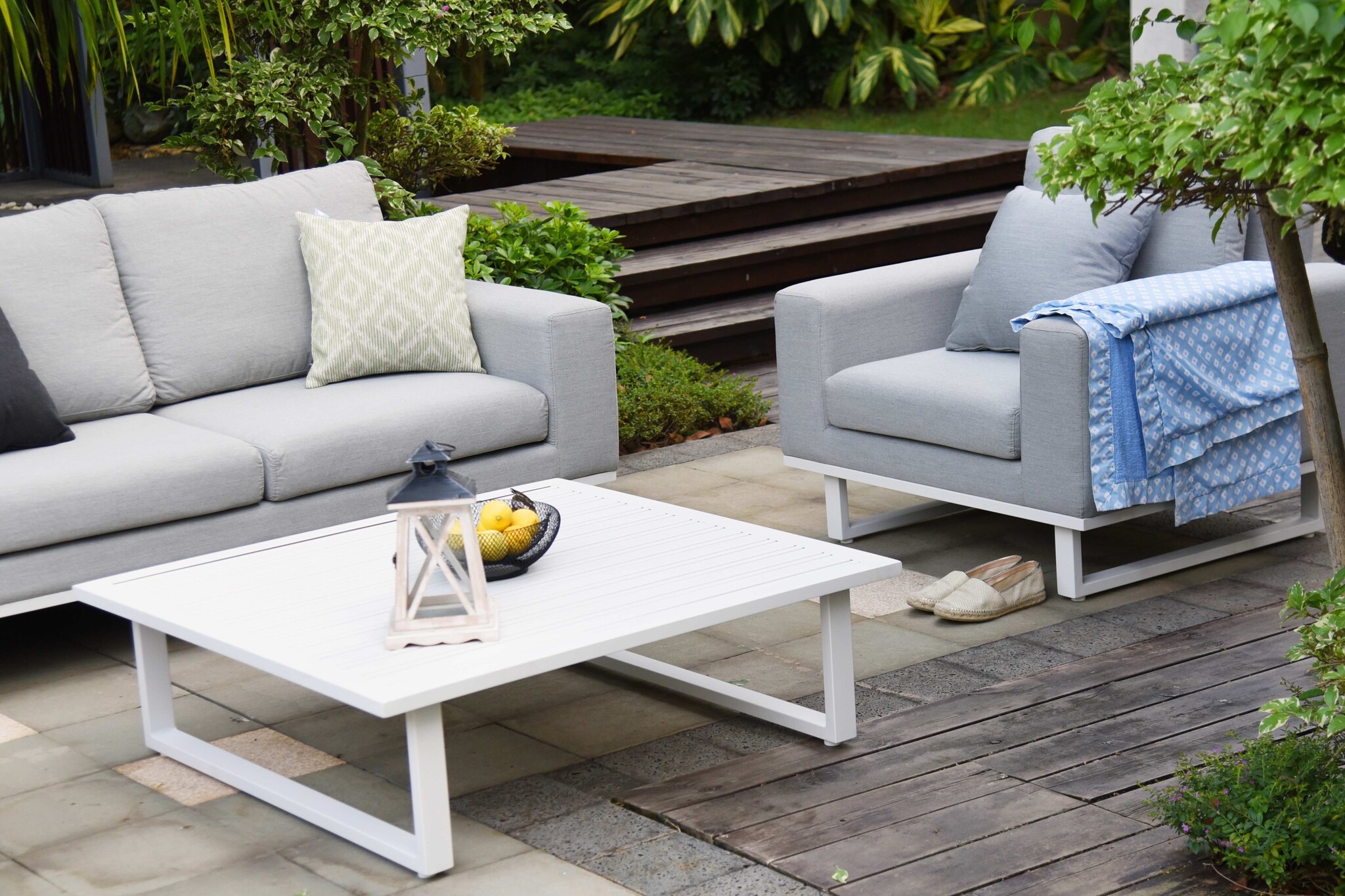 Gemaakt van hoogwaardige materialen en verkrijgbaar in verschillende kleuren zoals Lead chiné, Charcoal, Flanelle, of Taupe. De sterk waterafstotende buitenstof zorgt ervoor dat u zich net zo comfortabel voelt als op uw binnenbank, ongeacht het weer. Met het hoogwaardig gepoedercoat aluminium onderstel en de Quick dry foam vulling blijft uw set snel droog, zelfs na een regenbui. Geniet van de diepe zit en brede leuningen!