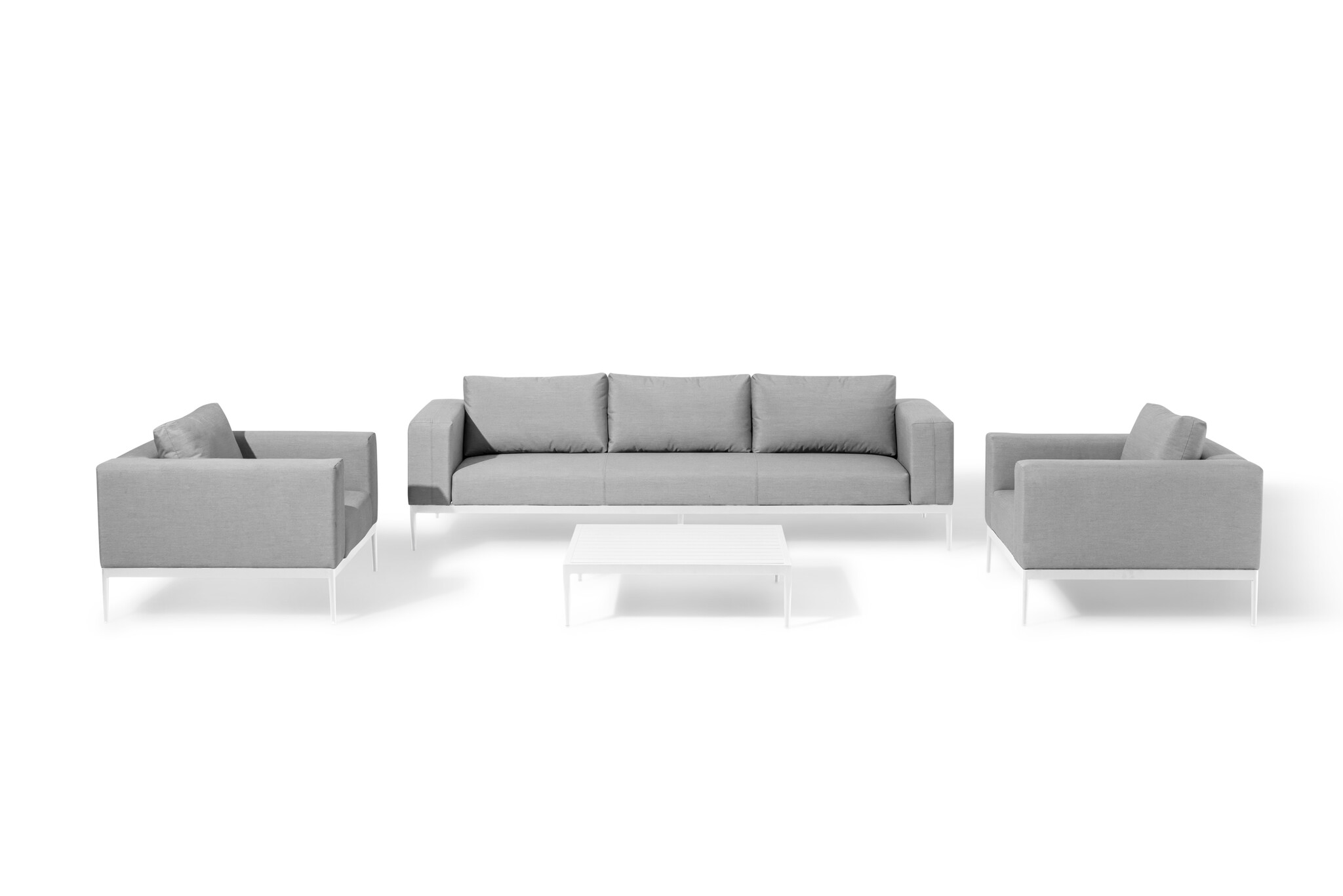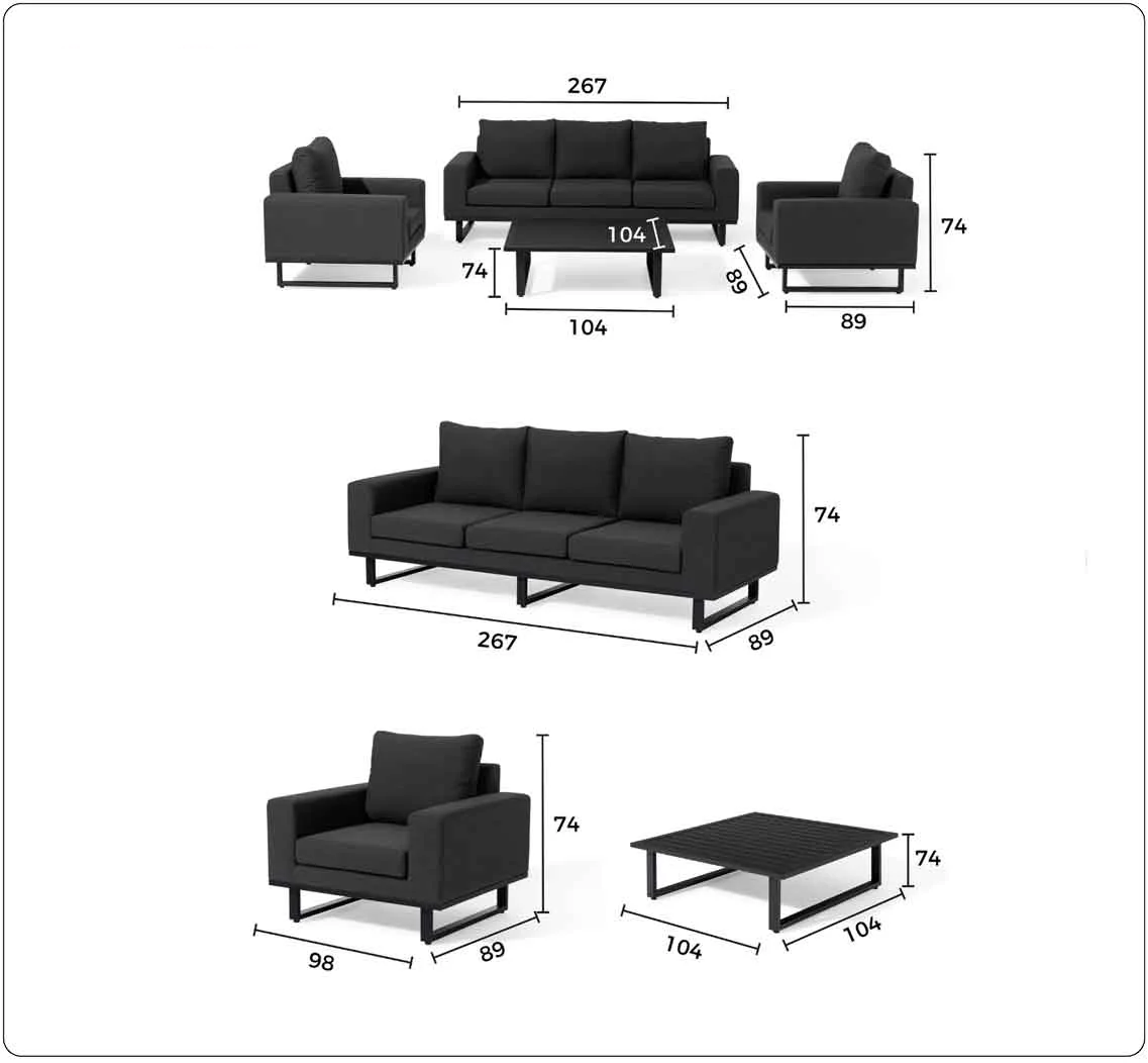 Afmetingen: | Loungeset (l x b x h): 2x stoel (l*b*h): 96*89*74 cm| Gewicht: 15.2 kg 1x driezitter bank (l*b*h): 216*89*74 cm | Gewicht: 31,4 kg 1x tafel (l*b*h): 104*104*32 cm | Gewicht: 14.2 kg |